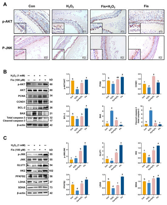 Effect of fisetin on the AKT signaling and the JNK signaling in the HA-OF model. (A) Immunohistochemical staining of p-JNK and p-AKT in SWF. Scale bars: 20 μm and 50 μm. (B) Activation of AKT signaling by fisetin in the H2O2-induced SWF. Phosphorylated AKT (Ser473) and total AKT were examined by Western blot. Quantification of AKT and its downstream signaling (p-AKT/AKT, PCNA, CCND1, BAX, BCL-2, and Caspase 3) was plotted on the right. The apoptotic level was determined by the normalized ratio of cleaved to total Caspase 3 and the protein quantification of BAX (n = 3). (C) Activation of JNK and regulation of glucose metabolism-related enzyme expression by fisetin, revealed by Western blot. Quantification of p-JNK/JNK, GLUT1, HK2, PFKFB2, LDHA, and SDHA is plotted on the right (n = 3). Values are shown as mean ± SEM. Different letters represent statistically significant differences among the groups (p < 0.05).