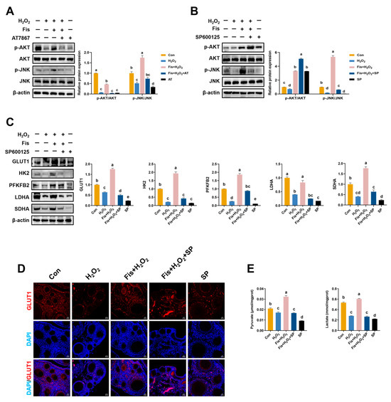 Given the crucial roles of AKT and JNK in follicular development, we treated the HA-OF model with the AKT inhibitor AT7867 (AT) and the JNK inhibitor SP600125 (SP), respectively. Compared with the con and Fis + H2O2 groups, AT treatment notably decreased p-AKT and p-JNK protein levels without affecting total protein levels (p < 0.01, Figure 8A). In contrast, SP inhibited p-JNK expression (p < 0.01), while having little impact on p-AKT levels, compared with the Fis + H2O2 group (p = 0.98, Figure 8B). In addition, SP significantly reversed the promoting effect of fisetin on the protein levels of GLUT1, HK2, PFKFB2, LDHA, and SDHA, compared with the Fis + H2O2 group (p < 0.001, Figure 8C). IF staining showed that SP treatment significantly inhibited the expression of GLUT1 in the ovary compared with the con and Fis + H2O2 groups (Figure 8D). Additionally, the production of pyruvate and lactate in SWF was significantly decreased by SP treatment, compared with the con and Fis + H2O2 groups (p < 0.001, Figure 8E).