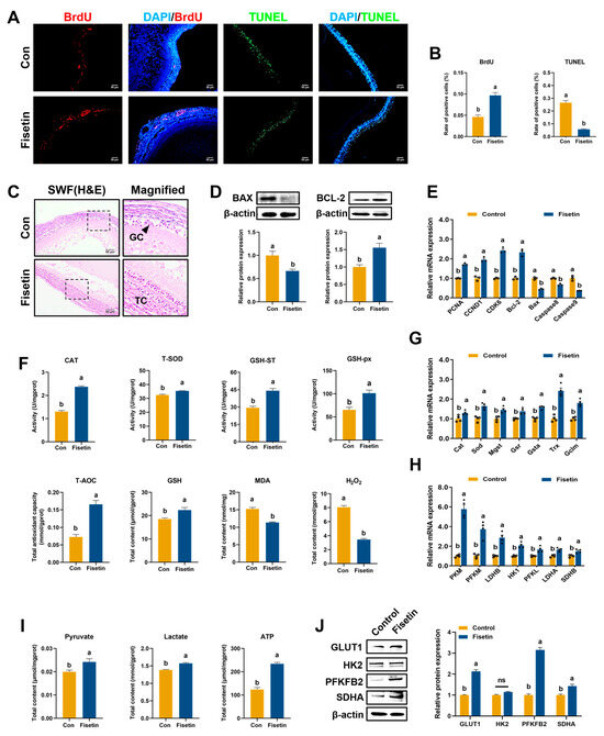 Effect of fisetin on the growth and development, antioxidant properties, and energy metabolism of aged SWF in vitro. (A) Representative images of BrdU (red) and TUNEL (green) assay of SWF in each group. The red dots represent proliferation-positive cells, and green dots represent apoptosis-positive cells. Scale bar: 50 μm. (B) Quantification of BrdU and TUNEL assay (n = 6). (C) Representative H&E staining images of SWF after 72 h culture in vitro, and images in the black dotted boxes were enlarged on the right. (D) Protein expression levels of BAX and BCL-2 in aged SWF (n = 3). (E) Relative mRNA levels of cell cycle-related genes (PCNA, CCND1, CDK6, Bcl-2, Bax, Caspase 8, and Caspase 9) in aged SWF (n = 3). (F) Levels of CAT, T-SOD, GSH-ST, GSH-Px, T-AOC, GSH, H2O2, and MDA in aged SWF (n = 6). (G) Relative mRNA levels of antioxidant-related genes (Sod, Cat, Mgst, Gsr, Gsta, Trx, and Gclm) in aged SWF (n = 4). (H) Transcription levels of glucose metabolism-related genes (PKM, PFKM, LDHB, HK1, PFKL, LDHA, and SDHB) in aged SWF (n = 4). (I) Contents of lactate, pyruvate and ATP in aged SWF (n = 6). (J) Relative protein levels of GLUT1, HK2, PFKFB2, and SDHA in aged SWF (n = 3). Values are shown as mean ± SEM. Different letters represent statistically significant differences among the groups (p < 0.05).