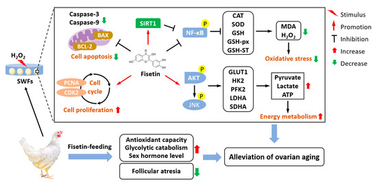 Dietary fisetin supplementation improved egg production, restored ovarian antioxidant capacity and energy metabolism in aged laying chickens. Furthermore, fisetin offers a potential strategy for optimizing ovarian energy supply through activation of the AKT and JNK signaling pathways. In conclusion, fisetin has multiple benefits as a feed additive, supporting both the health and reproductive performance of poultry (Figure 10).