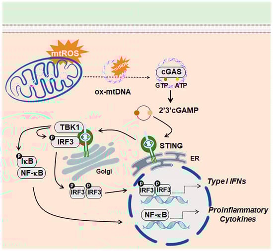 Activation of the cGAS–STING signaling pathway by cytosolic mtDNA. Mitochondrial oxidative stress favors the release of mtDNA. In the cytosol, mtDNA is recognized by cGAS, which then assembles into dimers and catalyzes the synthesis of cGAMP from ATP and GTP. cGAMP initiates the signaling cascade by binding to the ER-associated adaptor protein STING, which translocates to the Golgi apparatus, where it recruits and activates TBK1. TBK1 phosphorylates IRF3, which, in turn, targets the nucleus and transcribes interferon-stimulated genes. TBK1 can also relieve the inhibition of NF-κB, triggering the transcription of gene-encoding proinflammatory cytokines [72]. Abbreviations: ER, endoplasmic reticulum; cGAMP, cyclic 2′,3′-cyclic guanosine monophosphate; cGAS, cyclic GMP–AMP synthase; IRF3, interferon regulatory factor 3; NF-κB, nuclear factor kappa B; STING, stimulator of interferon genes; TBK1, TANK-binding kinase.