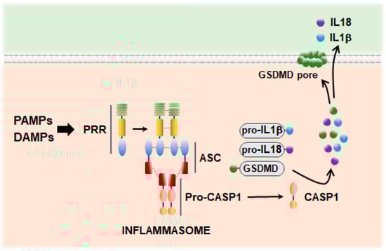 Inflammasomes are constituted by three main components: a sensor consisting of a PRR with a pyrin domain (PYD) and/or a caspase recruitment domain (CARD), the adaptor apoptosis-associated speck-like protein containing a CARD (PYCARD, also known as ASC), and the zymogen of CASP1 (pro-CASP1) (Figure 2). CASP1 consists of an N-terminal CARD, a CARD domain linker, the p20 subunit containing the catalytic sides, an inter-domain linker (IDL), and the p10 subunit involved in dimerization. Mechanistically speaking, it has been proposed that PRR clustering promotes a nucleation-induced polymerization of pro-CASP1 into filaments, facilitating the protease zymogens to undergo proximity-induced autoactivation [84]. The autocatalytic cleavage of pro-CASP1 results in two subunits that form an active p10/p20 tetramer [85], which has been proposed as responsible for the processing of pro-IL-1β and pro-IL-18 [86] and GSDMD (Figure 2). Additionally, CASP1 may also induce NF-κB-mediated pathways [87,88]. Recently, using a biotin-labeled probe that covalently binds to active CASP1, Boucher et al. have questioned the catalytic role of the p20/p10 tetramer under physiological conditions [89]. The study demonstrates that CASP1 clustering on inflammasomes produces active p46 dimers that self-process at the IDL to generate a second active species (p33/p10), which remains associated with the inflammasome. The activity of p33/p10 is blocked by a second self-cleavage event, which removes the CARD domain, releasing a highly unstable dimer (p20/p10) that terminates CASP1 signaling. Notably, the full-length dimeric p46 can effectively process GSDMD but not IL-1β, while p33/p10 can cleave both GSDMD and IL-1β.