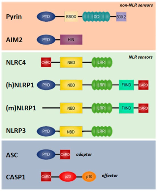 The NLR family members were the first sensor proteins identified in inflammasome formation (Figure 3). Recently, other families of inflammasome-associated PRRs have been described. These last include absent in melanoma 2 (AIM2)-like receptors (ALRs) that respond to self and pathogen double-stranded (ds)DNA molecules and pyrin receptors (also known as tripartite motif-containing (TRIM) 20), which assemble in response to perturbations of cytoplasmic homeostasis and cytoskeletal dynamics caused by infection (Figure 3). Nonetheless, the majority of inflammasomes rely on NLR proteins for pathogen sensing and scaffold assembly. All NLR sensors contain a central nucleotide-binding domain (NBD/NACHT) responsible for their self-oligomerization, a leucine-rich repeats (LRRs) domain crucial in the recognition of ligands (PAMPs and DAMPs), and signaling domains (PYR and CARD) that enable the recruitment of pro-CASP1 [92] (Figure 3). Major inflammasome-forming members are NLRP1, NLRP3, and NLRC4. Other atypical members of the family are NLRP2, NLRP6, NLRP7, NLRP12, and NLRC5, which, although less characterized, can also form an inflammasome complex [93]. Pro-CASP1 can directly interact with NLRC4 and mouse (m)NLRP1, through the CARD motifs, while in PYD-containing members, such as NLRP3 and human (h)NLRP1, the cysteine protease is recruited indirectly through homotypic interactions with the bipartite PYD/CARD adaptor ASC [94].