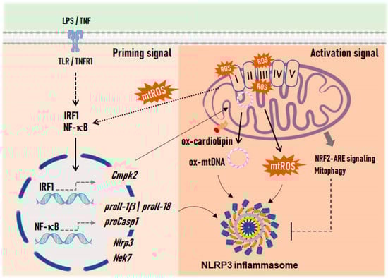 NLRP3 inflammasome signaling has been consistently related to mitochondrial dysfunction and oxidative stress (Figure 4). Accordingly, mitophagy induction prevents inflammasome assembly [104], while mtROS serves as a priming signal [61]. On the other hand, the increase in mtROS promotes the binding of NEK7 with NLRP3 [97,103] and facilitates the formation of the complex in mitochondria-associated membranes (MAMs) of dysfunctional mitochondria [105]. This process is suppressed when mitophagy is stimulated or when VDAC2, an isoform of the mitochondrial carrier linked to mtROS regulation, is silenced [105,106,107]. Additionally, it has been described that Ca2+ mobilization from the endoplasmic reticulum (ER) enhances inflammasome activation by inflicting damage to mitochondria [108]. Furthermore, optimal NLRP3 inflammasome signaling has been shown to require the interaction between NLRP3 and thioredoxin-interacting protein (TXNIP), a nuclear protein that relocates to mitochondria during oxidative stress [109,110]. In cerebral ischemia-reperfusion injury, the NLRP3-TXNIP binding and subsequent inflammasome activation are prevented by NFE2-like bZIP transcription factor 2 (NFE2L2, also known as NRF2), a master regulator of the cellular antioxidant system, which upregulates the expression levels of thioredoxin 1 (TRX1), a binding partner of TXNIP [111]. On the other hand, ROS-mediated externalization of cardiolipin to the outer membrane has been reported to promote the binding between NLRP3 and CASP1, which assemble upon ASC recruitment to the mitochondrial surface [112,113]. Externalized cardiolipin can also bind inflammasome-activated GSDMD, a necessary event for pyroptosis to proceed [114]. GSDMD permeabilizes the mitochondrial membranes, facilitating mtROS generation and the release of mitochondrial proteins and DNA. In turn, as indicated previously, the NLRP3 inflammasome can be activated by ox-mtDNA released into the cytosol [64,65] and is downregulated by autophagy and mitochondrial integrity preservation [115]. Zhong et al. described that NLRP3 priming relies on the induction of new mtDNA synthesis, downstream of TLR4 engagement, which ultimately triggers an interferon regulatory factor 1 (IRF1)-dependent expression of the mitochondrial nucleoside cytidine/uridine monophosphate kinase 2 (CMPK2) [116] (Figure 4). The resulting increase in CMPK2 levels regulates mtDNA replication by supplying the required deoxyribonucleotides. Cytosolic mtDNA also enables AIM2 inflammasome assembly [117]. Notably, while the NLRP3 inflammasome shows a preferential response to oxidized DNA [65], AIM2-containing counterparts have been suggested to primarily recognize non-oxidized DNA [116].