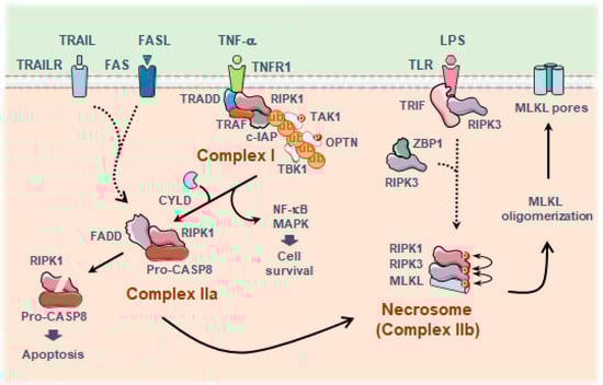 Necroptosis is a form of programmed necrosis mediated by the combined action of the receptor-interacting protein kinase 3 (RIPK3) and the pseudo-kinase mixed lineage kinase domain-like (MLKL) protein, with the participation of RIPK1 when death receptors are engaged [155]. The necroptotic molecular pathway has been most thoroughly studied in the context of the tumor necrosis factor receptor 1 (TNFR1) complex [156], although other members of the death receptor family, such as CD95/Fas and TRAILR, have also been implicated [157] (Figure 5).