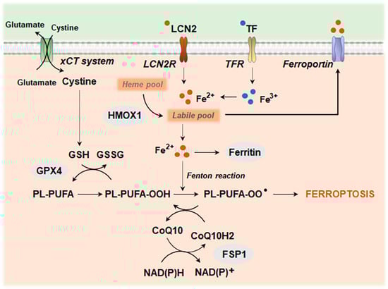 Core mechanisms of ferroptosis. TF and LCN2 transport extracellular iron into the cell through their respective receptors. Meanwhile, ferroportin is responsible for exporting intracellular iron to maintain iron balance. Inside the cells, HMOX1 breaks down heme to release free Fe2+, while ferritin, the iron storage protein, regulates intracellular iron levels to prevent iron overload. Ferrous iron (Fe2+) converts peroxides into free radicals through the Fenton reaction. This process leads to excessive lipid peroxidation and ultimately triggers ferroptosis. Ferroptosis can be prevented by two main antioxidant systems. One involves GPx4, which reduces lipid peroxides in a GSH-dependent reaction. The other is mediated by FSP1, which regenerates ubiquinone (CoQ10) to act as a trap for lipid peroxyl radicals. The cystine–glutamate antiporter SLC7A11 (xCT system) mediates the uptake of cystine, which is used for GSH synthesis. Abbreviations: CoQ10, coenzyme Q10; FSP1, ferroptosis suppressor protein 1; GPX4, glutathione peroxidase 4; HMOX1, heme oxygenase 1; LCN2, lipocalin 2; (PL-PUFA) phospholipids PUFA; SLC7A11, solute carrier family 7 member 1; TF, transferrin.