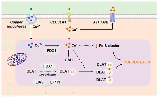 Molecular mechanisms of Cuproptosis. Extracellular copper can be transported within the cell via a copper ionophore (elesclomol, disulfiram, etc.). FDX1 reduces Cu2+ to Cu+, facilitating the release of copper ions in the mitochondrial matrix. FDX1 also binds to LIAS to promote lipoyl moiety generation. Then, LIPT1 transfers the LA to target proteins, such as DLAT. Lipoylated mitochondrial proteins (specifically DLAT) exhibit a high affinity for Cu+ binding, which causes their aggregation and loss of function. Moreover, excess of Cu+ reduces Fe-S cluster biosynthesis, destabilizes Fe-S cluster-containing proteins and contributes to overload Cu-mediated mitochondrial dysfunction and cell death. Copper importer SLC31A1 and exporters ATP7A/B can regulate the degree of cuproptosis sensitivity by controlling the intracellular concentration of copper ions. Also, GSH can serve as an endogenous copper chelator and protect against cuproptosis. Abbreviations: ATP7A/B, ATPase copper transporting alpha and beta; DLAT, dihydrolipoyl transacetylase; FDX1, ferredoxin 1; GSH, glutathione; LA, lipoic acid; LIAS, lipoic acid synthase; LIPT1, lipoyltransferase 1; SLC31A1, solute carrier family 31 member 1.