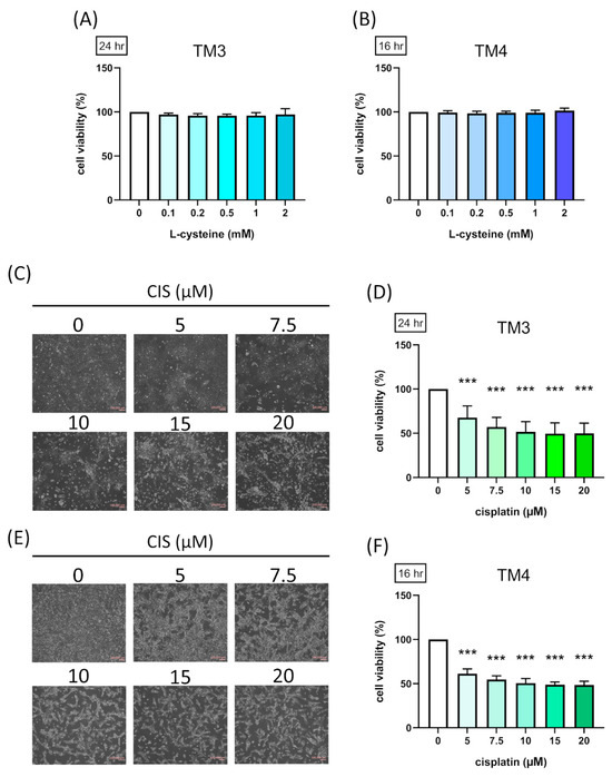 Effect of L-cysteine (CYS) and cisplatin (CIS) on TM3 and TM4 cell viability. TM3 (5000 cells/well) (n = 7) and TM4 cells (3000 cells/well) (n = 7) were cultured in a 96-well plate for cell viability assays. Cells were treated with different concentrations of (A,B) CYS (0.1, 0.2, 0.5, 1, and 2 mM) or (D,F) CIS (5, 7.5, 10, 15, and 20 µM) for 24 or 16 h and stained with MTS assay. (C) TM3 and (E) TM4 cells (4 × 104 cell/well) were cultured in a 12-well plate for cell morphology assessment. Scale bar: 100 μm. Data are represented as mean ± SD. Different groups were analyzed using one-way ANOVA following by Tukey’s multiple comparison test. *** p < 0.001 compared with the control group.