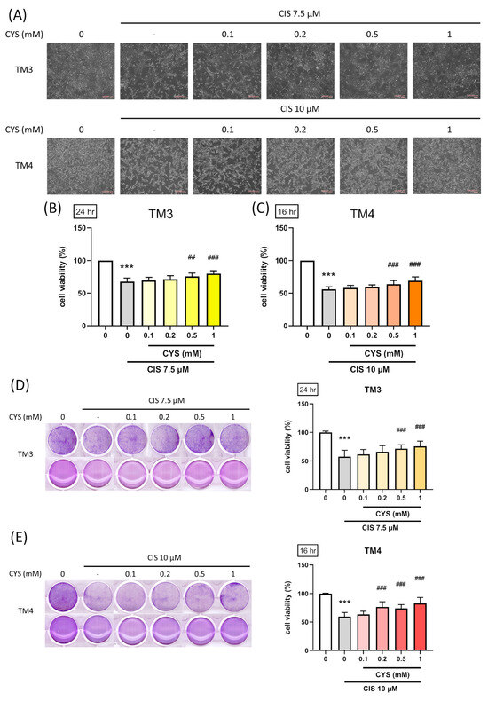 To understand the effect of CYS on cell viability and morphology in cisplatin-induced cell damage. We used the MTS assay kit and crystal violet staining to evaluate cell viability and composition. TM3 and TM4 cells were co-treated with different concentrations of CYS (0.1, 0.2, 0.5, and1 mM) and induced with CIS (7.5 or 10 µM) for 24 h (CIS group: 67.80 ± 5.29 (p value < 0.0001 compared with the control group); 0.1 mM: 69.70 ± 4.69 (p value = 0.93 compared with CIS group); 0.2 mM: 71.50 ± 5.28 (p value = 0.49 compared with CIS group); 0.5 mM: 75.70 ± 4.99 (p value = 0.003 compared with CIS group); 1 mM: 80.00 ± 4.29 (p value < 0.0001 compared with CIS group)) and 16 h (CIS group: 55.93 ± 3.89 (p value < 0.0001 compared with the control group); 0.1 mM: 59.50 ± 3.18 (p value = 0.95 compared with CIS group); 0.2 mM: 59.50 ± 3.18 (p value = 0.95 compared with CIS group); 0.5 mM: 63.86 ± 5.56 (p value = 0.35 compared with CIS group); 1 mM: 69.14 ± 5.75 (p value = 0.0093 compared with CIS group)), respectively. The results showed that 0.5 and 1 mM CYS significantly restored cell morphology (Figure 2A) and cell viability (Figure 2B,C). Crystal violet staining revealed consistent results in both cell types (Figure 2D,E) (TM3: CIS group: 57.64 ± 11.19 (p value < 0.0001 compared with the control group); 0.1 mM: 61.71 ± 8.34 (p value = 0.81 compared with CIS group); 0.2 mM: 66.28 ± 10.67 (p value = 0.09 compared with CIS group); 0.5 mM: 71.57 ± 6.79 (p value = 0.0007 compared with CIS group); 1 mM: 75.71 ± 8.99 (p value < 0.0001 compared with CIS group)) (TM4: CIS group: 59.58 ± 7.17 (p value < 0.0001 compared with the control group); 0.1 mM: 63.42 ± 5.60 (p value = 0.79 compared with CIS group); 0.2 mM: 76.58 ± 9.04 (p value < 0.0001 compared with CIS group); 0.5 mM: 74.00 ± 6.63 (p value < 0.0001 compared with CIS group); 1 mM: 82.92 ± 10.26 (p value < 0.0001 compared with CIS group). These findings indicate the protective potential of CYS on CIS-induced cell damage.