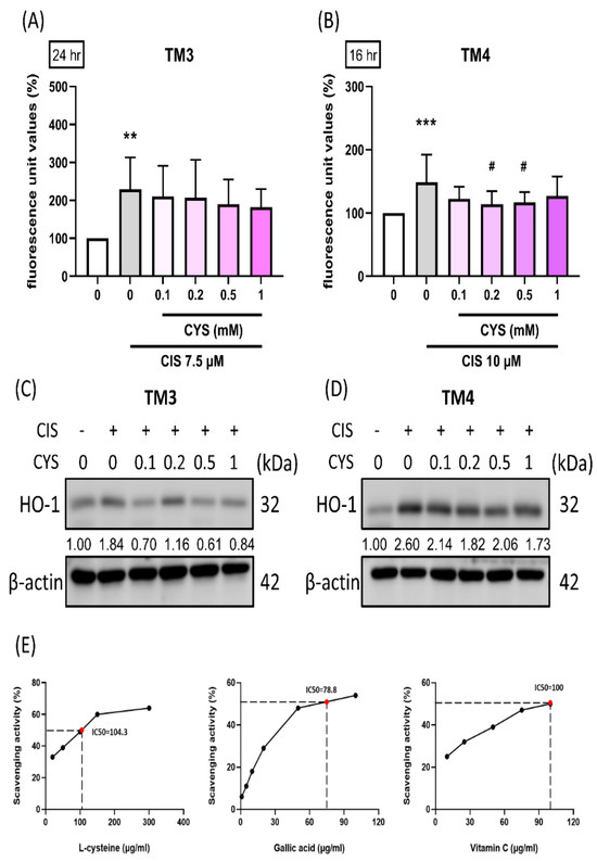 Effect of L-cysteine (CYS) on reactive oxygen species production in cisplatin (CIS)-induced TM3 and TM4 cells. The cells (1.2 × 105 cells/well) were cultured in a 6-well plate. They were co-treated with different concentrations of CYS (0.1, 0.2, 0.5, and 1 mM) and, respectively, induced by CIS (7.5 or 10 µM) for 24 and 16 h (n = 7). (A,B) ROS measurements were conducted by incubating the cells with 20 μM of DCFDA for 30 min at 37 °C in the dark. (C,D) HO-1 expression was analyzed by Western blot. (E) DPPH radical scavenging activity (%) of L-cysteine, gallic acid, and vitamin C. The IC50 DPPH values were obtained through extrapolation from regression analysis. Data are represented as mean ± SD. Different groups were analyzed using one-way ANOVA followed by Tukey’s multiple comparison test. ** p < 0.01 and *** p < 0.001 compared with the control group. # p < 0.05 compared with the CIS group.