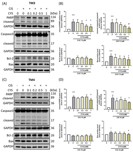 Effect of L-cysteine (CYS) on apoptosis-related protein expression in cisplatin (CIS)-induced TM3 and TM4 cells. (A) TM3 and (C) TM4 cells (1 × 105 cells) were cultured in a 6 cm dish. Cells were co-treated with different concentrations of CYS (0.1, 0.2, 0.5, and 1 mM) and induced with CIS (7.5 or 10 µM) for 24 and 16 h, respectively (n = 4). The protein expression of PARP, Caspase 3, Bcl-2, and Bax was determined by Western blot, and the band values were normalized to GAPDH. (B,D) Quantification of protein expression. Data are represented as mean ± SD. Different groups were analyzed using one-way ANOVA followed by Tukey’s multiple comparison test. * p < 0.05 and *** p < 0.001 compared with the control group. # p < 0.05 and ## p < 0.01 compared with the CIS group.
