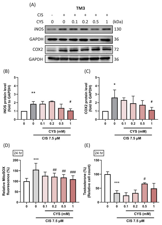 Effect of L-cysteine (CYS) on testosterone secretion-related modulators in cisplatin (CIS)-induced TM3 cells. TM3 cells (1 × 105 cell/well) were cultured in a 6 cm dish. Cells were co-treated with different concentrations of CYS (0.1, 0.2, 0.5, 1 mM) and induced with CIS (7.5 µM) for 24 h (n = 4). (A) The inflammatory protein expressions were determined by Western blot. (B) iNOS and (C) COX2 protein expression levels were normalized to GAPDH. (D) Mitochondrial oxidative stress was evaluated by MitoSOX staining, with fluorescence intensity. (E) Testosterone secretion in the culture medium was quantified using an ELISA kit. Data are represented as mean ± SD. Different groups were analyzed using one-way ANOVA followed by Tukey’s multiple comparison test. * p < 0.05, ** p < 0.01 and *** p < 0.001 compared with the control group. # p < 0.05, ## p < 0.01 and ### p < 0.001 compared with the CIS group.