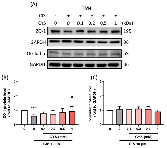 The blood–testis barrier (BTB) can confer protective effects that decrease cisplatin toxicity to the testicles [27]. To examine the integrity of the BTB structure, we evaluated the expression of tight-junction-related proteins by Western blotting. The results showed that CYS treatment significantly recovered ZO-1 protein expression (CIS group: 0.61 ± 0.13 (p value = 0.001 compared with the control group); 0.1 mM: 0.78 ± 0.12 (p value = 0.58 compared with CIS group); 0.2 mM: 0.75 ± 0.24 (p value = 0.75 compared with CIS group); 0.5 mM: 0.87 ± 0.23 (p value = 0.11 compared with CIS group); 1 mM: 0.95 ± 0.31 (p value = 0.017 compared with CIS group)) (Figure 6). However, neither CIS nor CYS affected Occludin protein expression (CIS group: 1.05 ± 0.22 (p value = 0.99 compared with the control group); 0.1 mM: 1.05 ± 0.12 (p value = 0.99 compared with CIS group); 0.2 mM: 1.10 ± 0.14 (p value = 0.99 compared with CIS group); 0.5 mM: 1.08 ± 0.18 (p value = 0.99 compared with CIS group); 1 mM: 1.07 ± 0.87 (p value = 0.50 compared with CIS group)). These results suggest that CYS only partially reverses the impairment in BTB structure (ZO-1) in CIS-induced TM4 cells.