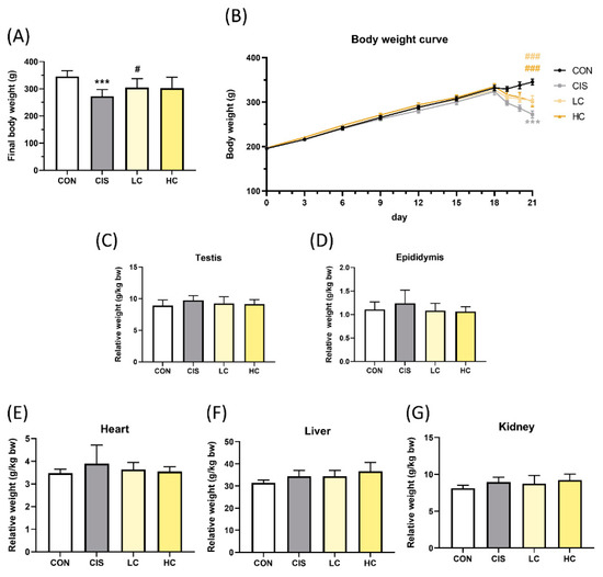 Effect of L-cysteine (CYS) on cisplatin (CIS)-induced weight and organ changes in in vivo model. (A) Body weight and (B) body weight changes, and the relative weight changes of the (C) testis, (D) epididymis, (E) heart, (F) liver, and (G) kidney in a CIS-induced animal model after CYS pretreatment (n = 8). Data are represented as mean ± SEM. Different groups were analyzed using Student’s t-test. *** p < 0.001 compared with the CON group. # p < 0.05 and ### p < 0.001 compared with the CIS group. CON: control; CIS: cisplatin (10 mg/kg bw); LC: low CYS (100 mg/kg bw); HC: high CYS (300 mg/kg bw).