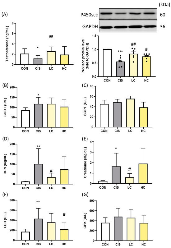 Protective role of L-cysteine (CYS) treatment for the biochemical indicators in cisplatin-induced in vivo model. (A) Testosterone and P450scc protein expression were evaluated by Western blot; (B) SGOT, (C) SGPT, (D) BUN, (E) creatinine, (F) LDH, and (G) CPK levels in a cisplatin-induced animal model after CYS pretreatment (n = 8). Data are represented as mean ± SEM. Different groups were analyzed using Student’s t-test. * p < 0.05, ** p < 0.01, and *** p < 0.001 compared with the CON group. # p < 0.05 and ## p < 0.01 compared with the CIS group. CON: control; CIS: cisplatin (10 mg/kg bw); LC: low CYS (100 mg/kg bw); and HC: high CYS (300 mg/kg bw).