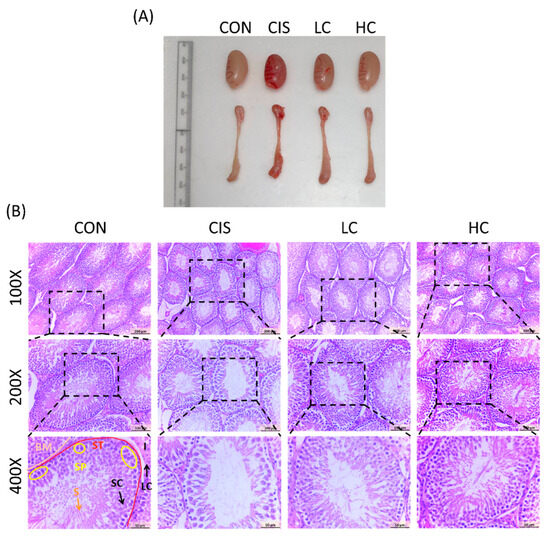 Effect of L-cysteine (CYS) on testicular damage in cisplatin (CIS)-induced male rats. (A) The appearance of the testis and epididymis. (B) Hematoxylin-and-eosin-stained sections of the testis, observed under magnification at ×100, ×200, and ×400. Observations were made on multiple sections (2–3) from each testicular fragment to ensure consistent and representative assessment. Labels in the figure include Basement Membrane (BM, beige line), seminiferous tubules (STs, red line), Sertoli cells (SCs), sperm (S), spermatocytes (SPs, yellow circle), Interstitial Tissue (I), and Leydig cells (LCs). Treatment groups: CON (control), CIS (cisplatin, 10 mg/kg bw), LC (low CYS, 100 mg/kg bw), and HC (high CYS, 300 mg/kg bw).