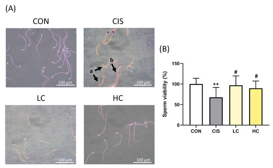 Effect of L-cysteine (CYS) on sperm morphology and viability in cisplatin (CIS)-induced animal model. (A) Sperm morphology stained with eosin Y and crystal violet, observed at 400× magnification. Black arrows indicate abnormal sperm, including (a) bent neck and (b) bent tail. (B) Sperm viability was assessed by counting the number of live and dead sperm. Data are represented as mean ± SEM. Different groups were analyzed using Student’s t-test. ** p < 0.01 compared with the CON group. # p < 0.05 compared with the CIS group. CON: control; CIS: cisplatin (10 mg/kg bw); LC: low CYS (100 mg/kg bw); and HC: high CYS (300 mg/kg bw).