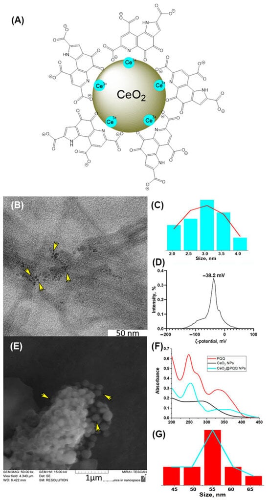 The synthesis of CeO2@PQQ NPs involved obtaining a sol of ‘bare’ CeO2 NPs, with-out the use of a stabilizer, forming a complex/modification of PQQ NPs and subsequent stabilization with NH4OH. CeO2@PQQ NPs were synthesized via the precipitation method [35]. The structure of the CeO2@PQQ NPs that were obtained is shown in Figure 1A. TEM revealed that the prepared CeO2@PQQ NPs had an average size of 3 nm (Figure 1B,C). The zeta potential of the CeO2@PQQ NPs was determined to be −38.2 mV (Figure 1D), indicating high colloidal stability. The SEM images showed that the CeO2@PQQ NPs were spherical in shape (Figure 1E). Spectroscopic analysis (Figure 1F) showed that the PQQ absorption peaks underwent a shift and change upon nanoparticles synthesis. This shift was particularly evident in the bathochromic shift of the 248 nm peak, which shifted to 257 nm, and the disappearance of the 275 nm peak, while the dynamic light scattering showed 55 nm as the hydrodynamic diameter of the NPs (Figure 1G).