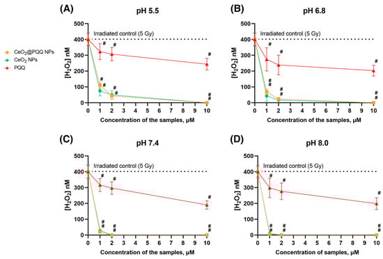 Redox activity of CeO2@PQQ NPs, CeO2 NPs, and PQQ obtained by enhanced chemiluminescence in a 4-iodophenol-luminol-horseradish peroxidase system at pH 5.5 (A), 6.8 (B), 7.4 (C), 8.0 (D). Data are shown as M ± SD and were analyzed using Welch’s t-test (n = 5) (# p < 0.005 vs. irradiated control, 5 Gy (400 μM)).