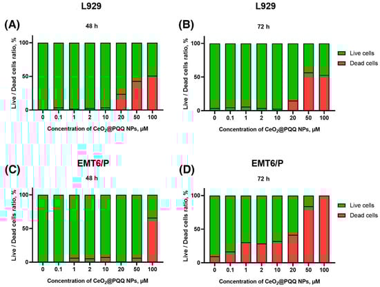 The incubation of CeO2@PQQ NPs with EMT6/P for 48 h showed an increase in the number of dead cells only at a concentration of 100 μM (66%) (Figure 4C). At the same time, during incubation with the NPs for 72 h (Figure 4D), cells apparently became more predisposed to the action of the NPs; here, an increase in the number of dead cells was observed, starting from the lowest concentrations. Thus, at a concentration of 0.1 µM NPs, cell mortality was 17%, and 100 µM led to 100% death of EMT6/P cells; although, for L929 at the same concentration, the maximum proportion of dead cells was 53%. Based on the data obtained, we selected CeO2@PQQ NPs concentrations ranging from 0.1 to 2 μM for the next stages of this study. These concentrations were chosen because they had no cytotoxic effects on any of the cell cultures.