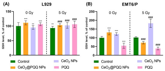Reduced glutathione levels (GSH) in L929 (A) and EMT6/P (B) cells after incubation with CeO2@PQQ, CeO2 NPs, and PQQ at a concentration of 2 μM. Here, 0 Gy corresponds to the groups that were not exposed to radiation, while 5 Gy corresponds to the groups that were exposed to X-rays at a dose of 5 Gy. Data are shown as M ± SD and were analyzed using Welch’s t-test (n = 5) (** p < 0.005, *** p < 0.005 vs. non-irradiated control; ### p < 0.005 vs. irradiated control).