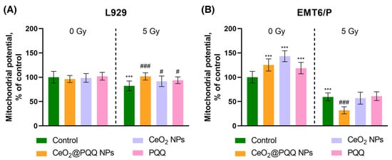 Mitochondrial membrane potential (MMP) in L929 (A) and EMT6/P (B) cells after incubation with CeO2@PQQ, CeO2 NPs, and PQQ at a concentration of 2 μM. Here, 0 Gy corresponds to the groups that were not exposed to radiation, while 5 Gy corresponds to the groups that were exposed to X-rays at a dose of 5 Gy. Data are shown as M ± SD and were analyzed using Welch’s t-test (n = 5) (*** p < 0.005 vs. non-irradiated control; # p < 0.05, ### p < 0.005 vs. irradiated control).