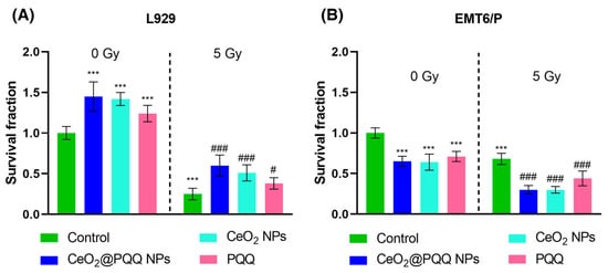 Cell survival fraction based on clonogenic assay of L929 (A) and EMT6/P (B) cells after incubation with CeO2@PQQ, CeO2 NPs, and PQQ at a concentration of 2 μM. Here, 0 Gy corresponds to the groups that were not exposed to radiation, while 5 Gy corresponds to the groups that were exposed to X-rays at a dose of 5 Gy. Data are shown as M ± SD and were analyzed using Welch’s t-test (n = 5) (*** p < 0.005 vs. non-irradiated control; # p < 0.05, ### p < 0.005 vs. irradiated control).