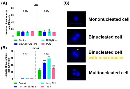 Micronucleus frequency of L929 (A) and EMT6/P (B) cells after incubation with CeO2@PQQ, CeO2 NPs, and PQQ at a concentration of 2 μM. Representative images of nuclei and micronuclei stained with DAPI are shown (the yellow arrow indicates a micronuclei) (C). Here, 0 Gy corresponds to the groups that were not exposed to radiation, while 5 Gy corresponds to the groups that were exposed to X-rays at a dose of 5 Gy. Data are shown as M ± SD and were analyzed using Welch’s t-test (n = 5) (* p < 0.05, ** p < 0.005 vs. non-irradiated control; # p < 0.05, ## p < 0.005, ### p < 0.005 vs. irradiated control).