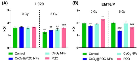 Nuclear division index (NDI) of L929 (A) and EMT6/P (B) cells after incubation with CeO2@PQQ NPs, CeO2 NPs, and PQQ at a concentration of 2 μM. Here, 0 Gy corresponds to the groups that were not exposed to radiation, while 5 Gy corresponds to the groups that were exposed to X-rays at a dose of 5 Gy. Data are shown as M ± SD and were analyzed using Welch’s t-test (n = 5) (*** p < 0.005 vs. non-irradiated control; ## p < 0.005, ### p < 0.005 vs. irradiated control).