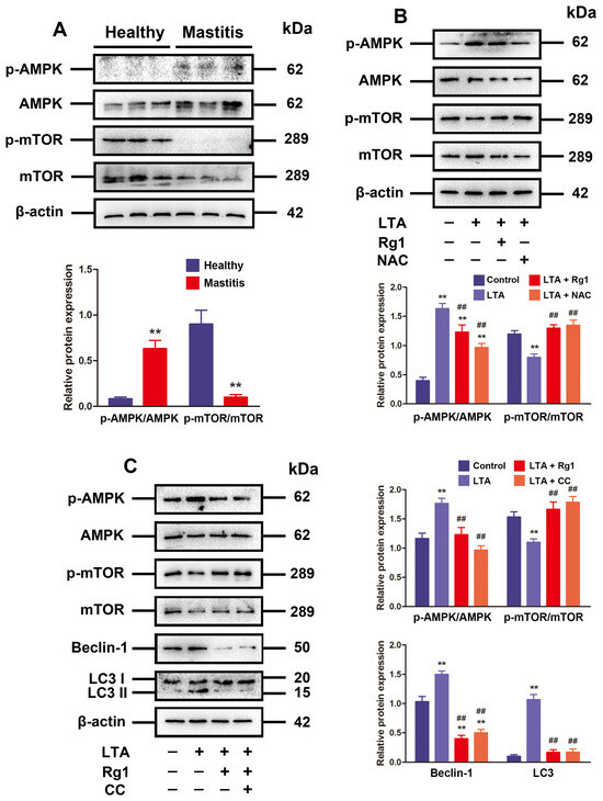 3.4. Rg1 Regulated the ROS/AMPK/mTOR Signaling Pathway to Inhibit LTA-Induced Excessive Autophagy