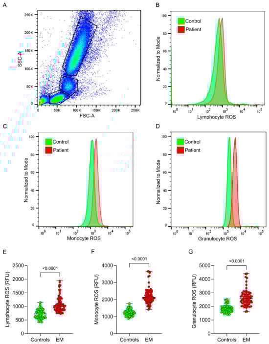 In Figure 1, intracellular ROS production in blood leukocytes from EM patients and matched controls is shown. ROS levels across all three leukocyte fractions in EM patients were significantly increased compared to controls (Figure 1B–D). Specifically, lymphocyte ROS were 1020 (879–1255) RFU in EM patients versus 723 (578–856) RFU in controls (p < 0.0001; Figure 1E), monocyte ROS levels were 2132 (1922–2431) RFU versus 1222 (1105–1348) RFU (p < 0.0001; Figure 1F), and granulocyte ROS levels were 2561 (2225–2908) RFU versus 1789 (1660–1996) RFU in controls (p < 0.0001; Figure 1G). These results indicate that oxidative stress is elevated in leukocytes from EM patients.