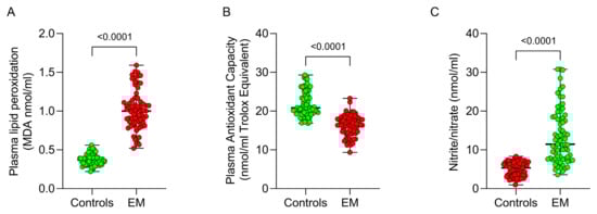 Redox status in plasma was assessed by measuring MDA (malondialdehyde, the main lipid peroxidation marker), total antioxidant capacity (TAC), and nitrate/nitrite levels. Lipid peroxidation was significantly higher in EM patients compared to controls (1.00 [0.83–1.12] vs. 0.37 [0.32–0.41] MDA nmol/mL; p < 0.0001), along with a marked reduction in TAC (16.41 [14.37–17.95] vs. 20.86 [19.66–24.22] mM Trolox equivalent; p < 0.0001; Figure 2A,B). Additionally, EM patients exhibited a significant increase in plasma nitrate/nitrite levels (11.46 [7.76–18.48] vs. 5.34 [3.5–6.86] nmol/mL; p < 0.0001; Figure 2C). These findings suggest systemic oxidative stress in EM patients.