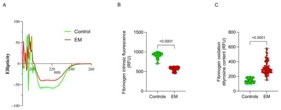 The protein function is closely linked to its structure and even minor changes in protein structure can significantly affect its biological activity. To evaluate the effect of fibrinogen oxidation on its structure, the far-UV CD spectra of fibrinogen purified from EM patients and matched controls were qualitatively compared. In controls, fibrinogen revealed a typical α-helical secondary structure with characteristic minima at 208 and 222 nm. In contrast, a decreased negative peak in the 215–225 nm region, indicating a reduced α-helical content (Figure 3A), and hence structural alterations, were found in fibrinogen from EM patients. The α-helix secondary structure is essential for maintaining fibrinogen’s structural integrity and functional properties. Rich in oxidation-prone amino acids like methionine, cysteine, and tyrosine, these α-helix regions are particularly vulnerable to modifications such as carbonylation, dityrosine formation, and disulfide bond alterations under oxidative stress. Such disruptions destabilize the protein structure, impairing fibrinogen’s ability to polymerize into fibrin and form clots with normal mechanical properties.