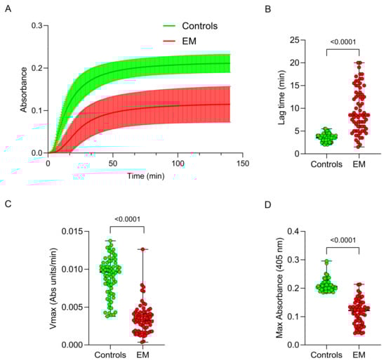 Fibrinogen functional modifications in EM patients compared to controls. Fibrinogen polymerization into fibrin in EM patients and controls is shown in Panel (A). Lag phase, maximum slope (Vmax), and maximum absorbance (Max abs) of fibrinogen polymerization curves in EM patients and controls are shown in the panels (B–D). The observed modifications are related to a different fibrinogen structure in EM fibrinogen compared to controls.
