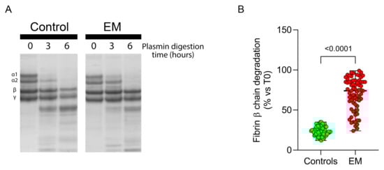 Additionally, when assessing fibrin susceptibility to plasmin-induced lysis, evaluated by quantifying the degradation of the fibrin β chain over 0 to 6 h of plasmin digestion (Figure 5A), fibrin from EM patients showed significantly higher levels of undigested fibrin compared to controls (74 [55–85] vs. 23 [20–29]; p < 0.0001), indicating increased resistance to fibrinolysis in EM patients (Figure 5B).