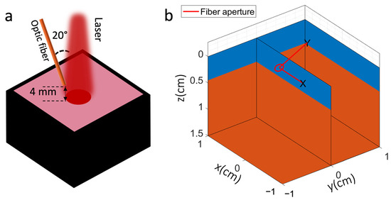 In this study, we used both simulations and experimental approaches to evaluate the effect of tissue’s optical properties on Photofrin-PDT and 1O2 luminescence detection through optic fibers. The wavelength of the treatment laser was 632 nm and 1O2 luminescence was detected at 1270 nm. The tissue optical properties at 632 nm within the clinically relevant range were as follows: the absorption coefficient () = 0.1–1.0 cm−1 and reduced scattering coefficient () = 5–40 cm−1 [13]. The additional due to 100 mg/kg of Photofrin was measured as 0.504 cm−1. at wavelengths (λ) of 632 nm and 1270 nm and was approximated by the Mie scattering theory, using μs′(λ) = Aλ−b [19]. We simulated the spatial distribution of the treatment laser and the detection of the 1O2 signal using a virtual optical fiber with the same core diameter and numerical aperture (NA) as the experimental fiber. Additionally, we compared the 1O2 signal from the Monte Carlo simulation with the experimentally detected signal from Photofrin in phantoms.