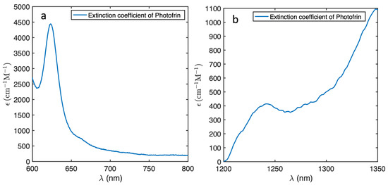 The extinction coefficient spectrum of Photofrin around the excitation (a) and 1O2 luminescence emission (b) wavelengths. The former is consistent with the values in the literature [25].