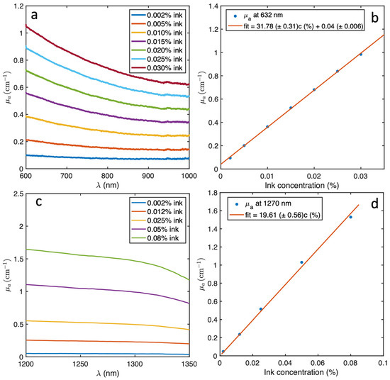 Figure 3a,c show the absorption coefficient of the black ink for various concentrations in the range of 600–1000 nm and 1200–1350 nm. The extinction coefficient at 632 nm and 1270 nm for 100 mg/kg Photofrin were 0.504 cm−1 and 0.06 cm−1, respectively. Focusing on the excitation wavelength of 632 nm and the emission wavelength of 1270 nm, the absorption coefficient was calculated and compared with the ink concentration as shown in Figure 3b,d. This comparison presented a linear relationship between the ink concentration and absorption coefficient. This allowed the manipulation of the absorption coefficient in the liquid phantom by adjusting the ink concentration in methanol.