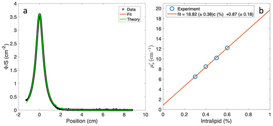 (a) An example of the measured light fluence rate per unit source strength (Φ/S) at 661 nm versus the distance along the catheter from a point source: fitted . (b) The reduced scattering coefficient from (a) at 661 nm for Intralipid as a function of the concentration and the corresponding linear fit.