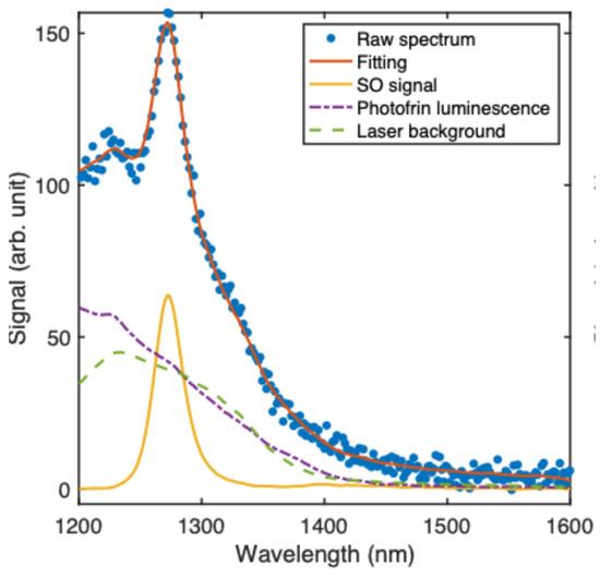 The spectral range of 1200–1600 nm adequately covered the 1270 nm 1O2 peak. Singular value decomposition (SVD) implemented in Matlab (R2022b, The Mathworks, Matick, MA, USA) was used to fit the 1O2 spectrum using a basis function for the 1O2 peak, the background from the laser, and near-infrared fluorescence from Photofrin. The latter was obtained by quenching the 1O2 with sodium azide (NaN3), while the 1O2 basis spectrum was obtained by subtracting the quenched spectrum from the unquenched spectrum. The laser background was directly measured from the source.