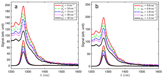 Figure 6a shows spectra and the extracted 1O2 luminescence peak with a varying absorption and fixed scattering, showing an inverse dependence, the corresponding 1O2 components are displayed below the spectra. Figure 6b shows the spectra and corresponding 1O2 signal for varying with fixed at 1.1 cm−1. The 1O2 signal increases non-linearly with in the range 5–20 cm−1 and saturates above this. The normalized intensity of the extracted 1O2 signal and the corresponding Monte Carlo simulation results demonstrates very good agreement as shown in Figure 7.