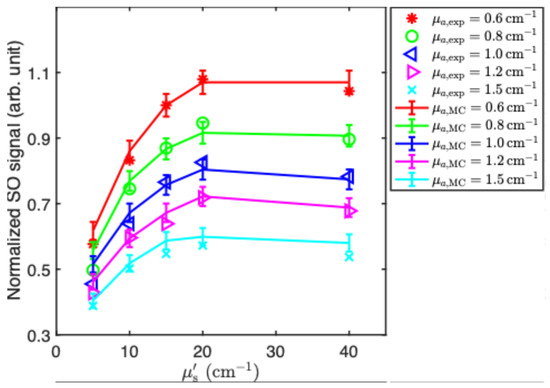 Dependence of the normalized 1O2 signal on the scattering coefficient at 632 nm, comparing the experimental data (points) and the Monte Carlo simulations (solid lines), normalized to the values of = 0.8 cm−1 and = 15 cm−1.