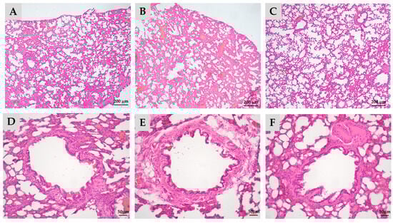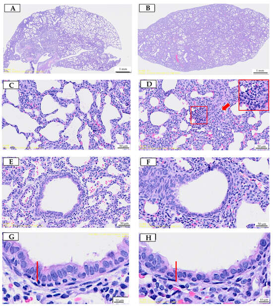 Lung tissues were preserved in 4% paraformaldehyde at 4 °C overnight, followed by dehydration through a series of ethanol gradients. Samples were cleared with xylene and embedded in paraffin wax. Sections from formalin-fixed tissues were sliced and stained using a hematoxylin and eosin (H&E) kit (ScyTek Laboratories, West Logan, WV, USA). Histological lesions were examined using a Leica DMI-3000 microscope equipped with a digital camera (Leica Biosystems, Buffalo Grove, IL, USA).
