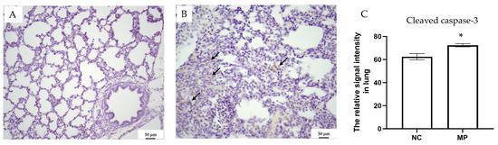 Cleaved caspase-3 staining for (A) the control and (B) PS-MPs group. The staining of cleaved caspase-3 is indicated with arrows. (C) Cleaved caspase-3 densities were quantified and compared between different groups. NC denotes the control group, while MP indicates PS-MPs exposure during pregnancy. Each group comprised six animals. Significant difference is indicated by *: p < 0.05.