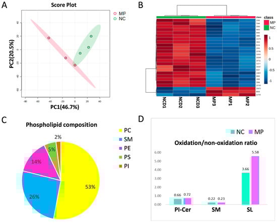 The differentially expressed lipid-soluble metabolites between the control group (NC) and prenatal PS-MPs exposure group (MP). (A) Principal component analysis (PCA) and (B) heatmap for lipid-soluble metabolites. The heatmap illustrates the top 25 metabolites with the most prominent differences between the two groups. In this display, the rows represent metabolite codes, columns represent samples, and the color intensity within each cell signifies the level of abundance (red = high; blue = low). (C) The composition of phospholipid from lung tissue of seven-day-old rat offspring. (D) Oxidized PI-Cer and SM in control group and in prenatal PS-MPs exposure group. Each group comprised three animals. Abbreviations: Cer, ceramide; PC, phosphatidylcholine; PE, phosphatidylethanolamine; PI, phosphatidylinositol; PS, phosphatidylserine; PA, phosphatidic acid; PG, phosphatidylglycerol; SM, sphingomyelin.