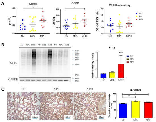 Oxidative stress in the lung tissue of pups. (A) Total glutathione (T-GSH), oxidized glutathione (GSSG), and ratio of reduced glutathione (GSH) to GSSG. Each group comprised 9–10 animals. (B) Western blot of Malondialdehyde (MDA) expression and semi-quantitative analysis. (C) 8-hydroxy-2-deoxyguanosine (8-OHdG) staining and semi-quantitative analysis. Magnification at 40× *: p < 0.05; **: p < 0.01; ***: p < 0.001. Each group comprised six animals.