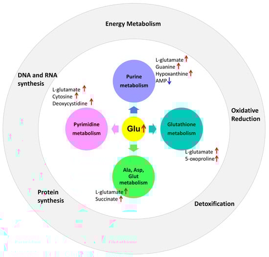 In addition to an increase in glutamate, prenatal PS-MPs exposure influences the pyrimidine metabolic pathway, resulting in elevated cytosine and deoxycytidine levels. In the purine metabolic pathway, increased levels of guanine and hypoxanthine were observed, whereas AMP levels decreased. Furthermore, in the alanine/aspartate/glutamate metabolic pathway, prenatal microplastic exposure leads to elevated levels of glutamate and succinate in the lung tissues of offspring. In the glutathione metabolic pathway, increased 5-oxoproline levels were detected in the lung tissues of the offspring (Figure 7).