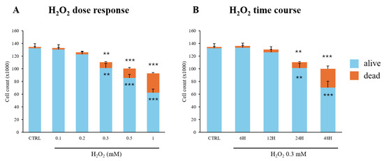 C2C12 myoblast viability was assessed using the Trypan blue exclusion assay, which distinguishes dead from living cells through direct cell counting under an inverted microscope. For the dose-dependent experiments, cells were treated with a range of H2O2 concentrations (0.1–1 mM) for 24 h. We observed a dose-dependent effect of H2O2 treatment, indicated by a decrease in the number of viable cells and a concomitant rise in dead cells (Figure 1A). A concentration of 0.3 mM of H2O2 was then selected for all subsequent experiments.