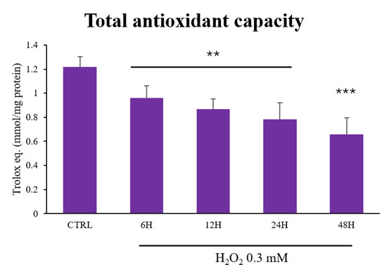 To evaluate whether the H2O2 treatment altered the antioxidant capacity in the myoblasts, we tested the time-dependent effects of 0.3 mM H2O2 administration on cellular total antioxidant capacity (TAC) over a period of 6 to 48 h. We observed a statistically significant decrease in TAC values over time (p < 0.05), with a reduction of up to 45% after 48 h of treatment (p < 0.01, Figure 2).