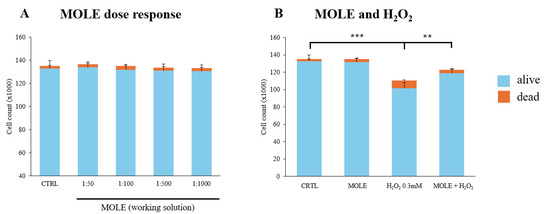 We found that hydrogen peroxide exposure induced a decrease in the total number of cells (24% reduction, p < 0.001) and a fourfold increase in the number of dead cells (p < 0.001) compared to control cells (Figure 3B). Notably, MOLE administration significantly mitigated the harmful effects induced by hydrogen peroxide (p < 0.01, Figure 3B).